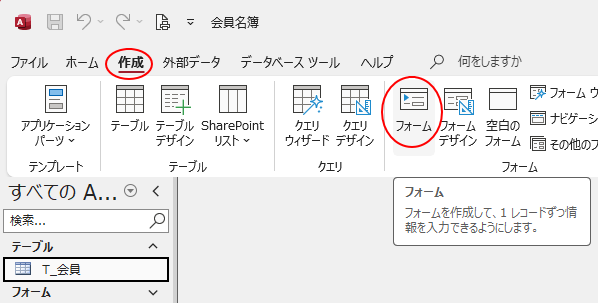 テーブル[T_会員]を選択して、[作成]タブの[フォーム]グループにある[フォーム]をクリックします。